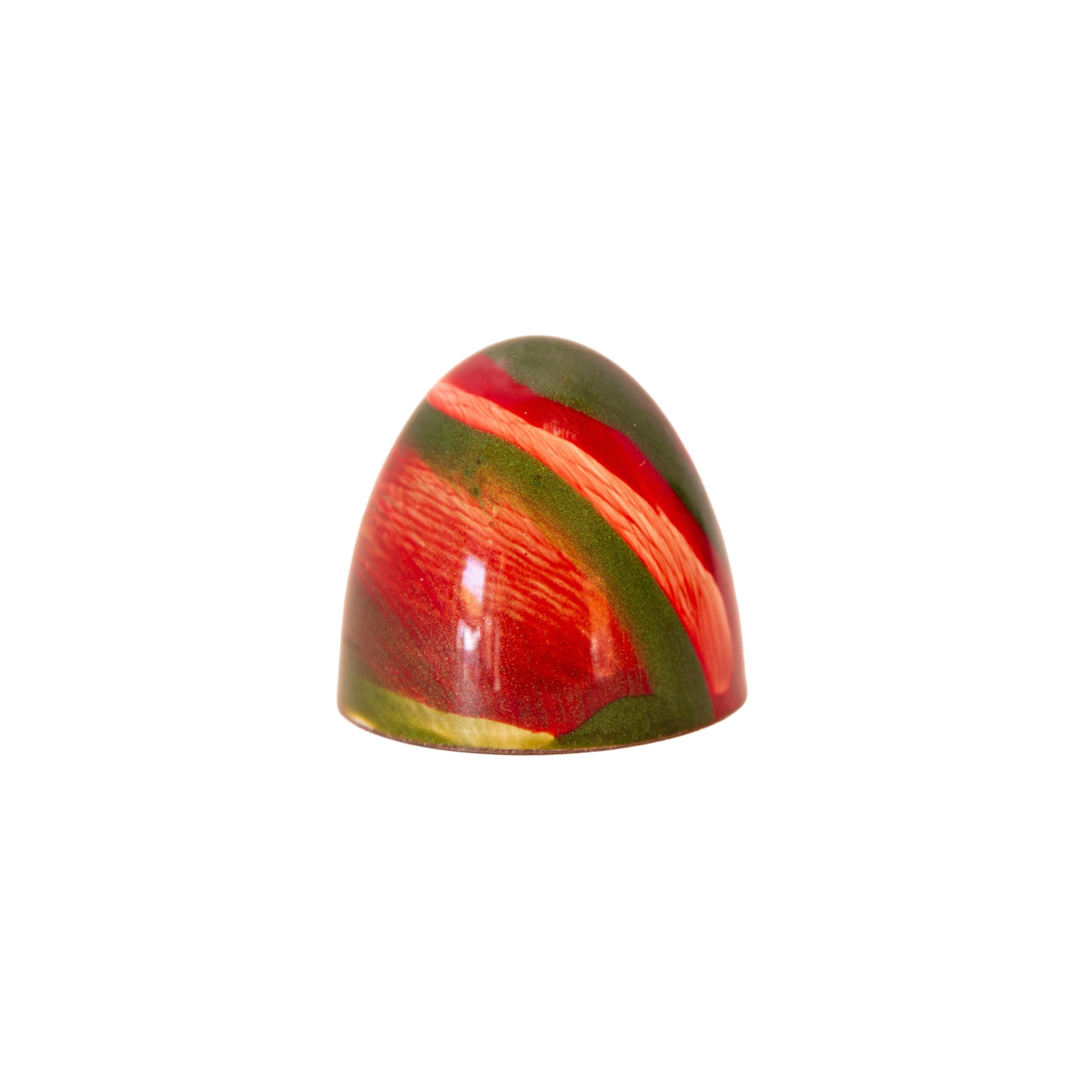 We blend Arabica coffee with hazelnut praline to craft a festive Gianduja-style filling. Paired with a natural almond marzipan centre, this combination offers a sweet and nutty contrast to the coffee’s bitterness. The chocolate bonbon is then coated in dark couverture, providing a rich cocoa background that elevates the flavours of the filling.