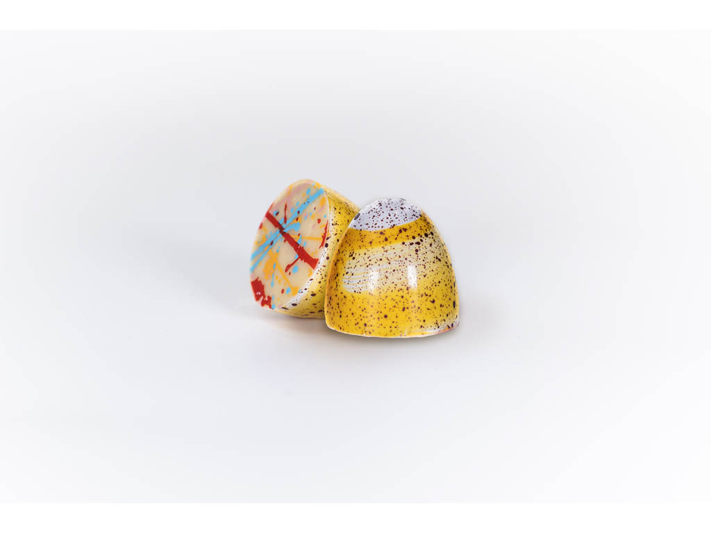 Ingredients and Allergens BOLD: couverture chocolates (cocoa mass, cocoa butter, milk powder (MILK), lecithin (SOYA) sugar), cream (MILK), butter (MILK), skimmed milk (MILK), sugar, salt, sorbitol, dextrose, glucose, invert sugar, yuzu fruit, extra-virgin olive oil, new season rhubarb, Morello cherries, oranges, passion fruit, Madagascan vanilla, hazelnuts (NUTS), almonds (NUTS), arabica coffee beans, coloured cocoa butter (E171, E172, natural colours), citric acid, yellow pectin, white rum, coconut, white and black sesame seeds (SESAME), custard powder (EGG), fleur de sel.